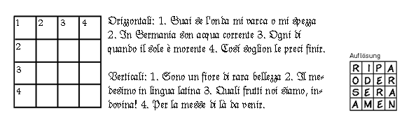 Am 14. September 1890 erschien in der italienischen Zeitschrift "Secolo Illustrato della Domenica" ein kleines, quadratisches Rätsel des Journalisten Giuseppe Airoldi, das schon stark an ein Kreuzworträtsel erinnert. Rätsel dieser Art findet man immer wieder und man nannte sie "doppeltes magisches Quadrat" - doppelt, weil die Fragen senkrecht und waagrecht verschieden sind. ("Magische Quadrate" enthalten Wörter, die sowohl waagrecht wie senkrecht verlaufen.)